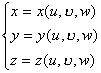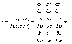 Oxyz空间的有界三维闭区域双方单值地映射到O'uw空间的闭区域V',并且当(u, ,w)V'时其雅可比式