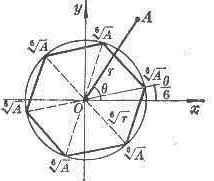 几何说明:复平面上与数r(cosθ+isinθ)的n次方根对应的点是一个正n边形的顶点,这些顶点在以原点为中心,以
