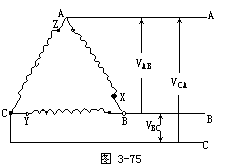 【电源绕组的三角形接法】 将一相绕组的末端与另一相绕组的始端相接,组成一封闭三角形,再由绕组间彼此连接的各点引出三根导线作为连接负载之用。这样的连接法称为“三角形接法”,也称“△接法”。如图3-75所示。由图中可见,在△接法中,端线之间的线电压也就是电源每相绕组的相电压,因此有