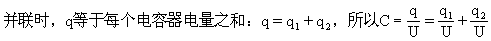 =C1+C2即并联总电容等于每个电容器电容之和。电容器并联时电容增大,串联时电容减小。实用中可根据需要而选用并联和串联。