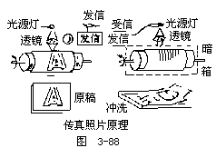 【传真】 利用电线或通过无线电发送不动图象(信件、图片、照片、报纸等)。传真的原理与电视相似,不过因为不动图像的发送可以延续足够长的时间,所以图像的分解速度及信号的发送速度都不要求很快。这种对图象的复合与分解,都可以采用机械装置;对于发送,可以采用相当窄的频带,也就是可以利用普通的通信线路,例如利用电话线路就可以传真。宇航中拍摄的照相,都是采用电视的传真照相,这些照片是利用电波传送回来的“传真照片”。传真的照片是把传送的照片改为电讯信号播放,由受信的接收站收取这些“电讯信号”,再改成照片,同时也可收取世界各地的传真广播,遇有重大新闻时,可以收取照片,再行转印成的新闻照片分发,这种照片的价值及其功用是很高的。它的传送方法如图3-88所示。发放照片传真的地方,是先把照片卷在一个圆形筒上,这个圆筒以一定的速度旋转,在旋转的画面上,依靠一个很细小的光点,以扫描的方式扫过整个画面。照片的影像可以看做是由无数个深浅不同的小点组成,所以当扫描的光点扫到照射照片上的某个小点时,小点较浅的地方反射强,而在较暗地方反射弱。其光线反射的亮度不同,便由光电管(把光线变成电信号的电子管)反射光的强弱转变为电流的变化。于是,照片的图象被转变为电讯号。电讯信号再通过发信机将电波传播到很远的地方。受信一方的设备,恰好和发信地相反,把电流的变化改做强弱的光线,就可以在感光胶片上得到画片的底片,所以,受信的一方也要有如发信地方的那样圆筒,用同样速度旋转;在圆筒上套上感光片,为防止其他光线的干扰,圆筒必须装在暗箱里。受信的接收机收到发来的电信时,把强弱不同的电信号变为扫描光点的强弱变化,光点扫到感光的不同部位,产生不同的曝光效果,从而得到从远方传送来的传真照片。