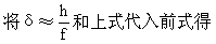 【物像公式】 描述物像位置以及它们和透镜或透镜组的特征量之一(焦距)之间的关系式。对一个薄凸透镜可以认为是由底面朝向透镜中央的许多棱镜的集合,而这些棱镜的顶角是很小的,对于顶角很小的棱镜来说,如果构成棱镜的材料的折射率为n,顶角为A,那么在近轴光线的条件下,其偏向角δ为常数(n-1)A。当棱镜给定后,近轴光线的偏向角δ是不变的。我们可以利用此关系来推导薄透镜的物像公式。如图4-13a所示,设PM为平行光束所任一条光线在M点入射,而OM=h,则出射光线MF′必通过透镜的焦点F′,OF′=f,f为透镜的焦距。根据近轴光线的条件,即f>>h,偏向角近似为