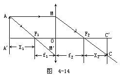 【牛顿公式】 设X1表示物体与第一焦点的距离,而X2表示光像与第二焦点的距离,由图4-14可以看出,△CC′F2~△MOF2和△M′OF1~△AA′F1放大率