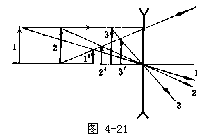 【凹透镜】 两侧面均为球面或一侧是球面另一侧是平面的透明体,中间部分较薄,称为四透镜。分为双凹、平凹及凸凹透镜三种,如图4-11a所示之A、B、C。其两面曲率中心之连线图4-11b所示之G1H,称为主轴,其中央之点O称为光心。通过光心的光线,无论来自何方均不折射。图4-11c表示,平行主轴之光束,照于凹透镜上折射后向四方发散,逆其发散方向的延长线,则均会于与光源同侧之一点F,其折射光线恰如从F点发出,此点称为虚焦点。在透镜两侧各有一个。凹透镜又称为发散透镜。四透镜的焦距,如图4-12所示。是指由焦点到透镜中心的距离。透镜的球面曲率半径越大其焦距越长,如为薄透镜,则其两侧之焦距相等。