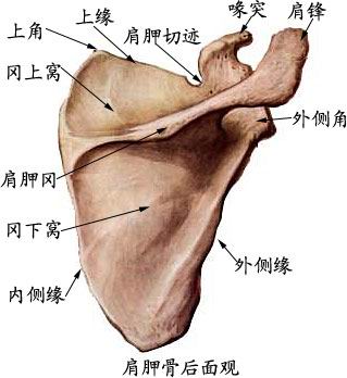 (1)肩胛骨:呈三角形,分两面、三缘、三角。后面有肩胛冈,末端延为肩峰,是肩部最高点。外侧角形成关节盂,参与肩关节构成。上角、下角分别平对第二、第七肋,是计数肋骨的标志。