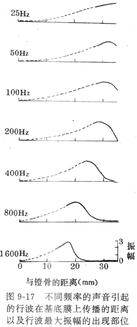 (二)基底膜的振动和行波理论当声流振动通过听骨链到达卵圆窗膜时,压力变化立即传给隔离蜗内液体和膜性结构;如果卵圆窗膜内移,前庭膜和基底膜也将下移,最后是鼓阶的外淋巴压迫圆窗膜外移;相反,当卵圆窗膜外移时,整个耳蜗内结构又作反方向的移动,于是形成振动。可以看出,在正常气传导的过程中,圆窗膜实际起着缓冲耳蜗内压力变化的作用,是耳蜗内结构发生振动的必要条件。有人用直接观察的方法,详细记录了声音刺激引起的基底膜振动的情况,这对于了解基底膜振动的形式,以及这种振动在耳蜗接受不同频率的声音刺激时有何差异,提供了可靠的依据。观察表明,基底膜的振动是以行波(traveling wave)的方式进行的,即内淋巴的振动首先是靠近卵圆窗处引起基底膜的振动,此波动再以行波的形式沿基底膜向耳蜗的顶部方向传播,就像人在抖动一条绸带时,有行波沿绸带向远端传播一样。下一步还证明,不同频率的声音引起的行波都从基底膜的底部,即靠近卵圆窗膜处开始,但频率不同时,行波传播的远近和最大行波的出现部位有气温同,如图9-17所示,;这就是振动频率愈低,行波传播愈远,最大行波振幅出现的部位愈靠近基底膜顶部,而且在行波最大振幅出现后,行波很快消失,不再传播;相反地,高频率声音引起的基底膜振动,只局限于卵圆窗附近。