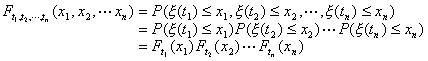 [随机过程的有穷维分布函数族] 设{x (t),tÎT}是随机过程,对任意的正整数n及任意的t1, t2, L,tnÎT,随机变量x (t1) ,x (t2) ,L,x (tn)的联合分布函数为