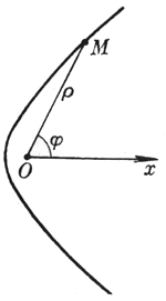 (极坐标方程.极点位于一焦点上,极轴为从焦点背向顶点的射线,p, e如前述.由此方程只能确定一支,另一支可由对称性而得到)