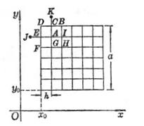 上式表明了以(x,y)为中心时,u(x,y)的函数值与周围各点函数值的关系,但对于邻近边界节点的点(x,y),如图14.9中的A,就不能直接使用上式,此时将划分网格的直线族延伸,在延伸线上定出与边界距离为h的点,称这些点为外邻边界节点,如图14.9A为中心时,点E,C为边界节点,点J,KE,C的外邻边界节点,用下法补充定义外邻边界节点J处函数的近似值uJ,便可应用上面的公式.