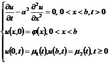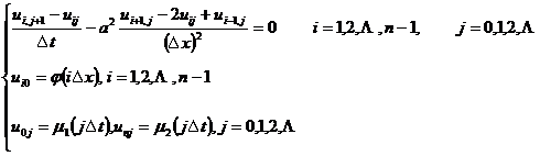 由此可按t增加的方向逐排求解.在第0排上ui0的值由初值(ix)确定,j+1ui,j+1的值可由第j排的三点(i+1,j),(i,j),(i1,j)上的值ui+1,j, uij,ui-1,j确定,而u0,j+1,un,j+1已由边界条件1((j+1)t)2((j+1)t)给定,于是可逐排计算一切节点上的uij.(x), 1(x)2(x)充分光滑,且时,差分方程收敛而且稳定.所以利用差分方程1计算时,必须使,即.