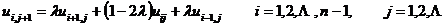 与上段一样,利用和在第0排及第1排的已知数值(初始条件)ui0 , ui1可计算ui2,然后用已知的ui1 , ui2可计算ui3,类似地可确定一切节点上的uij.
